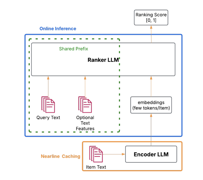 Mix-LLM [5] addresses the computational challenges of ranking systems by replacing candidate item descriptions with compact embedding tokens, thereby significantly reducing prompt length for ranker LLMs. Since item embeddings can be pre-computed and cached, the number of tokens requiring processing during online inference is substantially reduced, enabling more efficient real-time ranking. The training methodology employs a knowledge distillation framework: a textual teacher model is first trained on full item descriptions to capture rich semantic relationships, then distilled into a mixed-input student model. This distilled model is deployed for online inference, enabling the capture of complex query-item-feature interactions that surpasses the representational capacity of bi-encoder architectures, while maintaining the computational efficiency necessary for production deployment.
