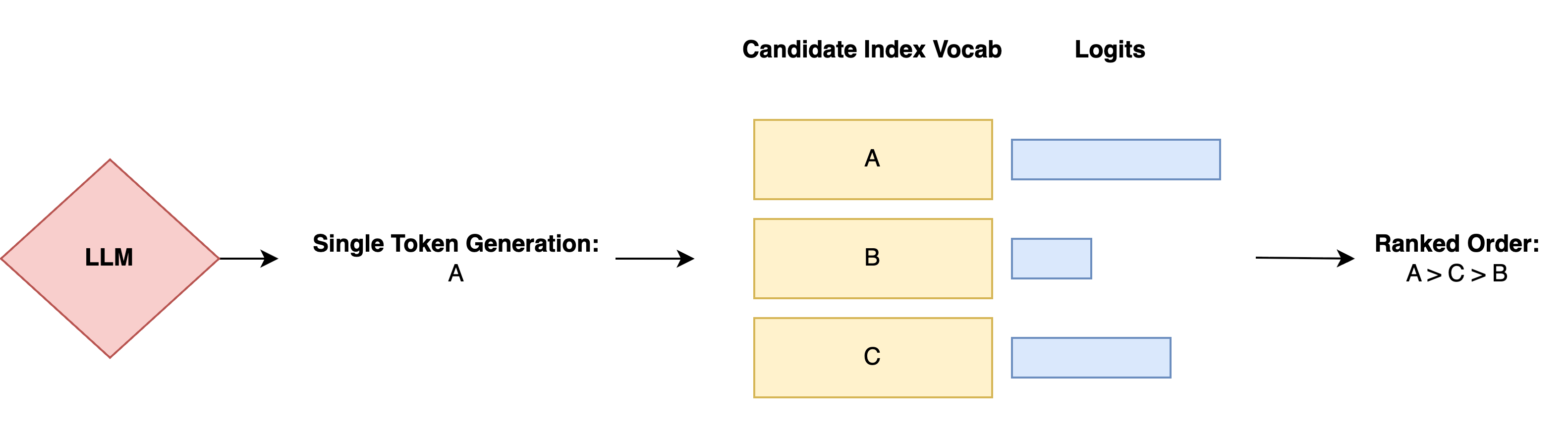On inference side, ranked list output lacks efficiency due its sequential nature. On the other hand, single token decoding utilizes the first generated identifier from LLM head's output logits to directly determine ranking order [2] [3]. This method significantly accelerate inference speed for closed vocab style list-wise re-ranking applications.